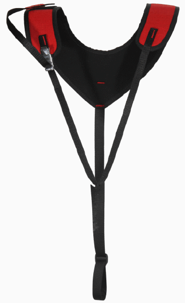Y-Brustgurt mit Schnallverstellschnalle aus Metall zur Fixierung einer Bruststeigklemme. Der Brustgurt wird mittels eines Dreistegs am Hüftband des Sitzgurtes befestigt und ist so mit jedem Gurt kombinierbar. Mit breitem Polster im Schulterbereich. Das nach der Schnalle überstehende Band kann mittels Klett am Schulterpad fixiert werden.