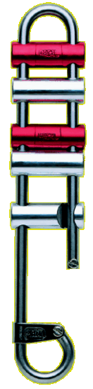 Ein 5-Stege Rack mit gerader Einhängeöse. Die Stege sind aus Vollaluminium und der Körper aus Stahl. Das Besondere an diesem Abseilgerät ist, daß man die Reibung jederzeit verändern kann, indem man die Anzahl der benutzten Stege verändert. Auch durch eine Veränderung des Abstandes der Stege untereinander kann die Reibung verändert werden (eng = langsam). Diese Eigenschaft ermöglicht ein sehr gleichmäßiges Abseilen. Es ist hervorragend für lange Schächte geeignet. Die Stege sind austauschbar.