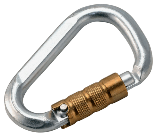 HMS-Triplelock-Karabiner aus Stahl mit Key-Lock-Verschluß. Der Triplelock-Verschluß wird zum Öffnen angehoben und gedreht. Lässt man den Schnapper los, verriegelt er automatisch.