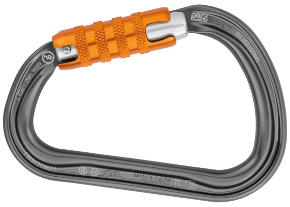 Triactkarabiner aus Aluminium mit Key-Lock-System. Wird durch eine Schiebe- und Drehbewegung geöffnet.