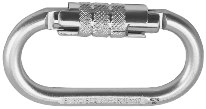 Stahlkarabiner mit Triplelock-Verschluß. Der Triplelock-Verschluß wird zum Öffnen angehoben und gedreht. Lässt man den Schnapper los, verriegelt er automatisch. Mit Key-Lock-System.
