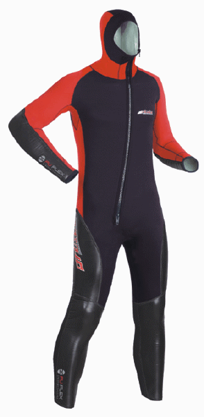 Overall aus aus 5,5 mm doppelt kaschiertem Neopren mit integrierte 3,5 mm Superflex Haube. Die Innenseite ist mit hochisolierendem Silver Fleece Lining ausgestattet und dadurch hoch wärmeisolierend. Die wasserdichten Blindstichnähte sind zusätzlich geklebt. Mit einer Knie-, Gesäß- und Ellenbogenverstärkung aus hochelastischem, 5,5 mm Neopren mit höchst abriebfester PU Flex Beschichtung für harte Beanspruchungen. Mit einer extra Gesäß-, Elbogen- und Knieverstärkung aus höchst abriebfestem Supratex für harte Beanspruchungen. Ein Zwei-Wege YKK Frontreißverschluß sorgt für ein bequemes An-/Ausziehen.