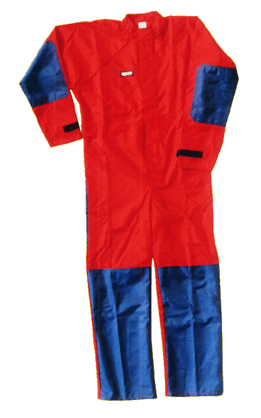 Overall aus Nylon. Der Stoff ist dünn mit Polyurethan beschichtet und somit nicht wasserdicht, dafür eher dampfdurchlässig. An Gesäß, Knie und Ellenbogen ist der gleiche Stoff aufgedoppelt. Sehr gute, meistens innenliegende Vernähungen. Brustöffnung mit Velcro-Klettverschluß, eine Brusttasche innen mit Klettverschluß und Klettverschluß an den Armenden gehören zur Ausstattung.
